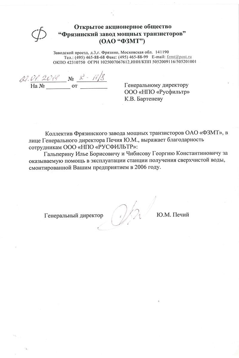 Объем работ ООО «НПО «Русфильтр» :